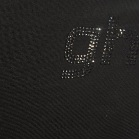T-shirt nera realizzata in jersey pesante 230g/m² per una struttura oversize di presenza, comfort e carattere. Il logo Ghosthustlers è ricamato interamente con strass neri tono su tono.