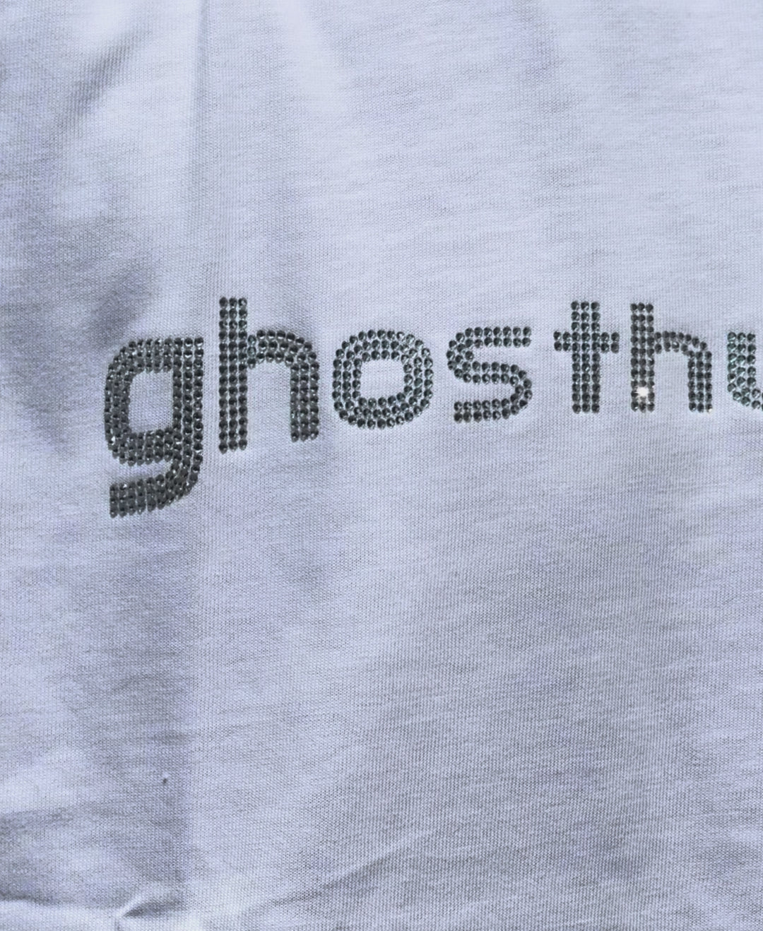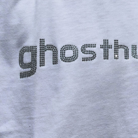 T-shirt realizzata in jersey pesante 230g/m² per una struttura oversize di presenza, comfort e carattere. Il logo Ghosthustlers è ricamato interamente con strass crystal.